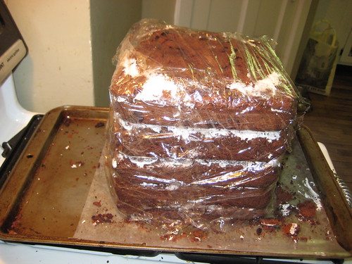 So I started baking. And stacking. And baking. I chilled each new brownie pan in the fridge until I could handle it and put icing on it without it melting all over, and glued them together (with icing) as they came out. If I’d had more pans, this process would have been much faster…